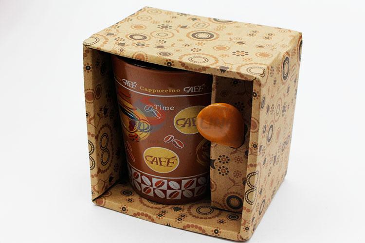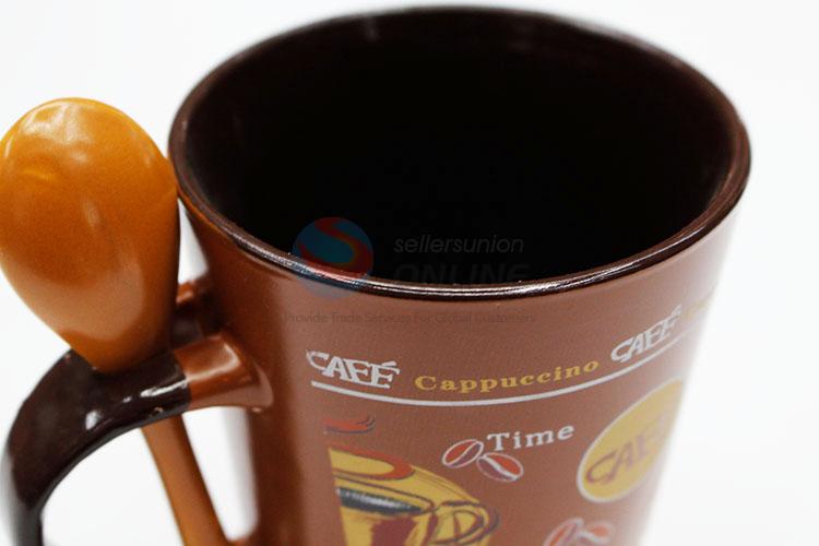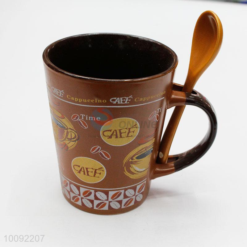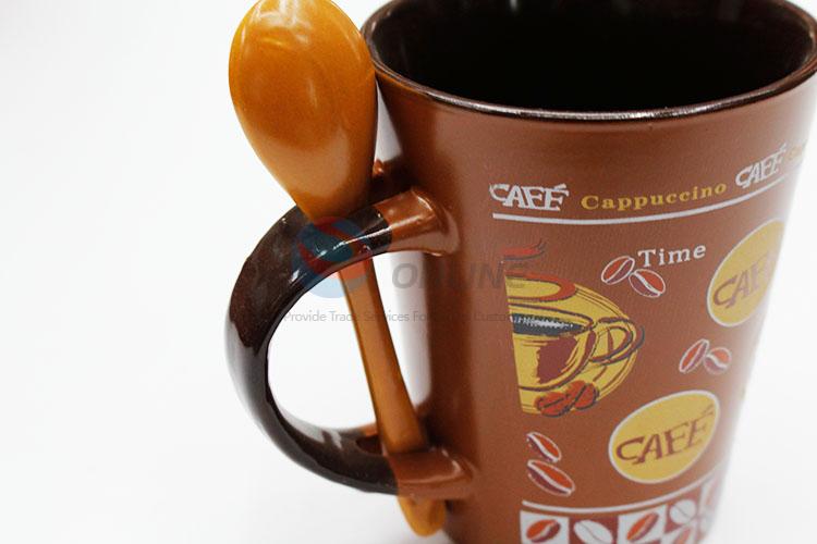 Brown ceramic cup with spon and spon sit