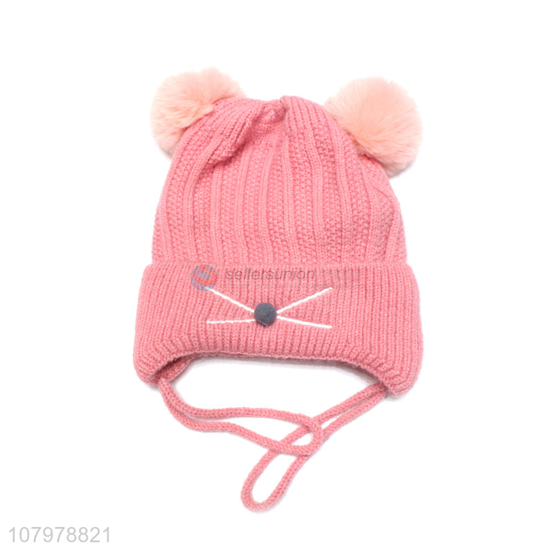 Yiwu market kids winter warm fleece lined beanies pom pom earmuffs hat