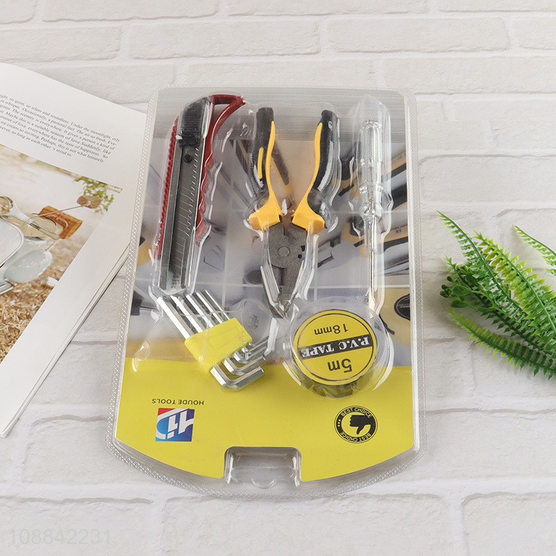 China imports home tool kit with pvc tape, hex key set, electrical test pen, plier & utility knife