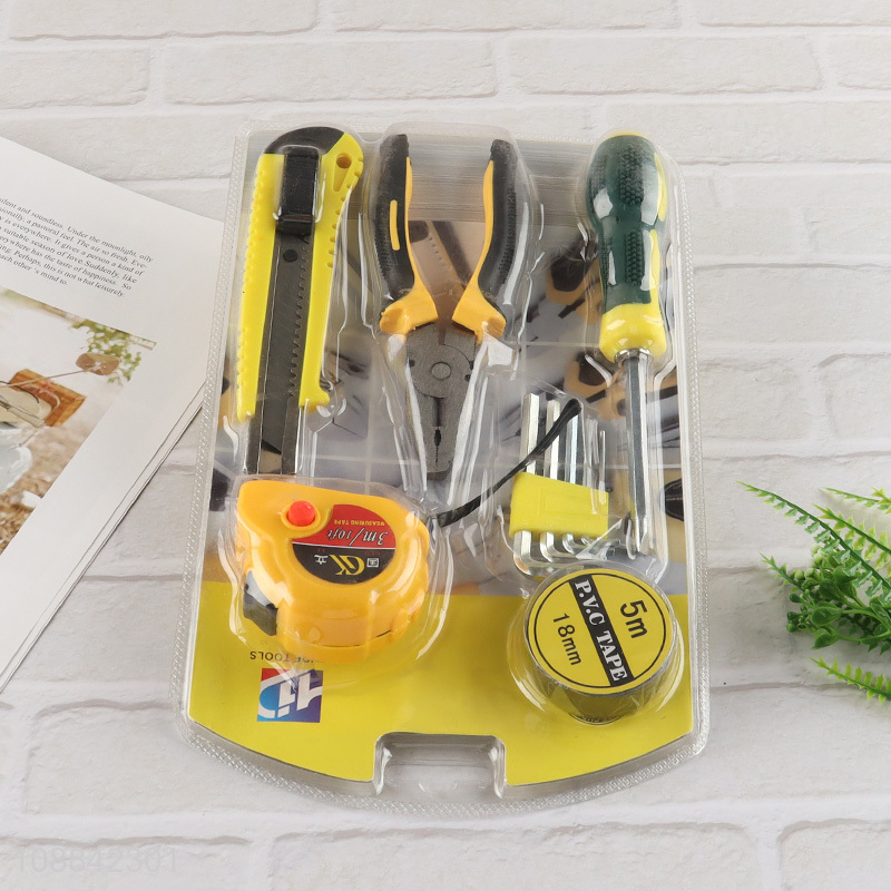 Factory price home tool kit with pvc tape, tape measure, hex key set, screwdriver, plier & utility knife