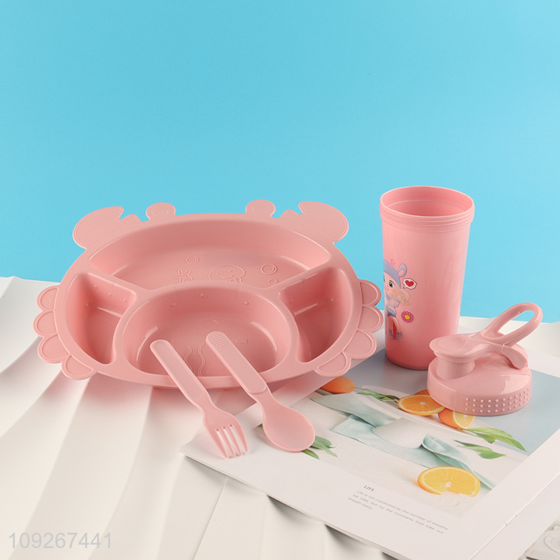 Good price pink girls plastic crab shape dinner plate and water bottle set